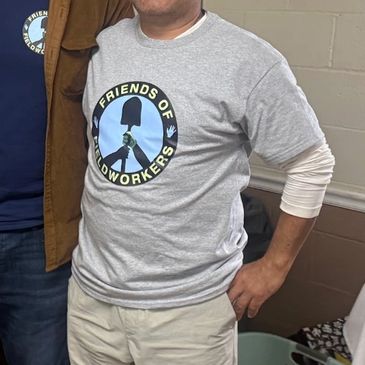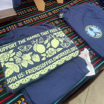 Dark Blue with green artwork FOF logo on front artwork on the back: Support the hands that feed us, Join us: Friendsoffieldworkers.org